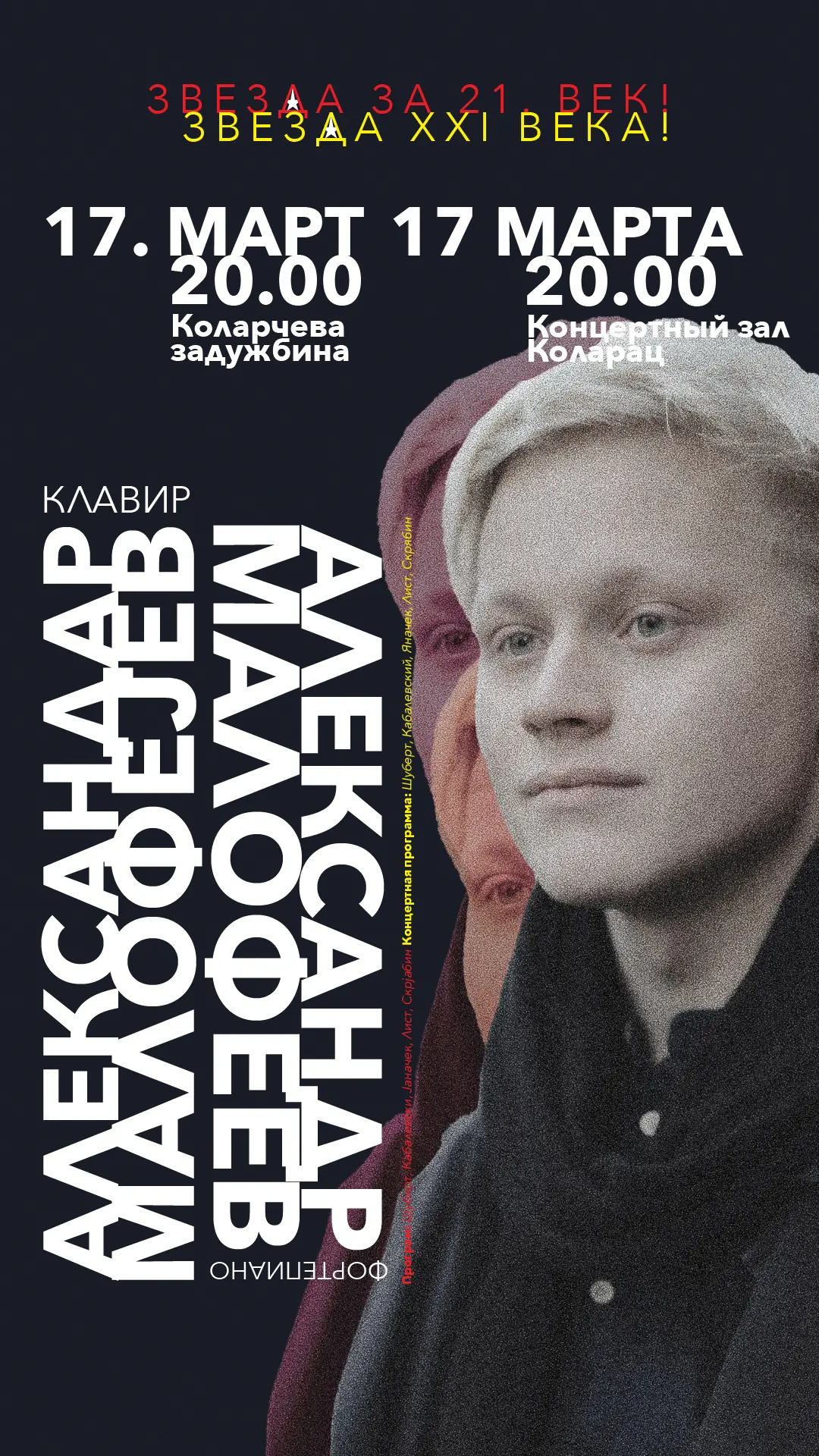 Uporedo sa najvećim svetskim muzičkim umetničkim scenama, Velika dvorana Zadužbina Ilije M. Kolarca biće mesto susreta beogradske publike i mladog pijaniste svetske slave Aleksandra Malofejeva (23) u ponedeljak 17. marta od 20 časova.
