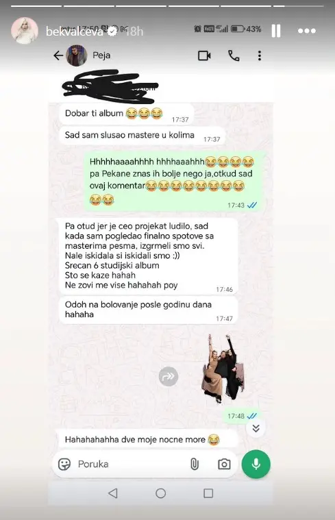"Pa otud jer je ceo projekat ludilo, sad kad sam pogledao finalno spotove sa masterima pesma, izgrmeli smo svi. Nale iskidala si, iskidali smo. Srećan šesti studijski album, što se kaže. Ne zovi me više. Odoh na bolovanje posle godinu dana", napisao je izvesni Peja, saradnik Bekvalčeve.