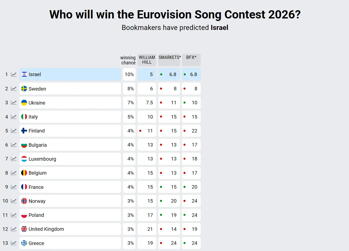 Na vrhu je Izrael, zbog čijeg se učešća vodilo mnogo polemika te su neke zemlje odlučile da bojkotuju Evroviziju 2026.