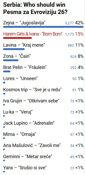 Prema informacijama poznatog evrovizijskog sajta Eurovision World, koji objavljuje prognoze kladionica i anketa, najviše šansi za pobedu ima Zejna Murkić sa numerom "Jugoslavija".