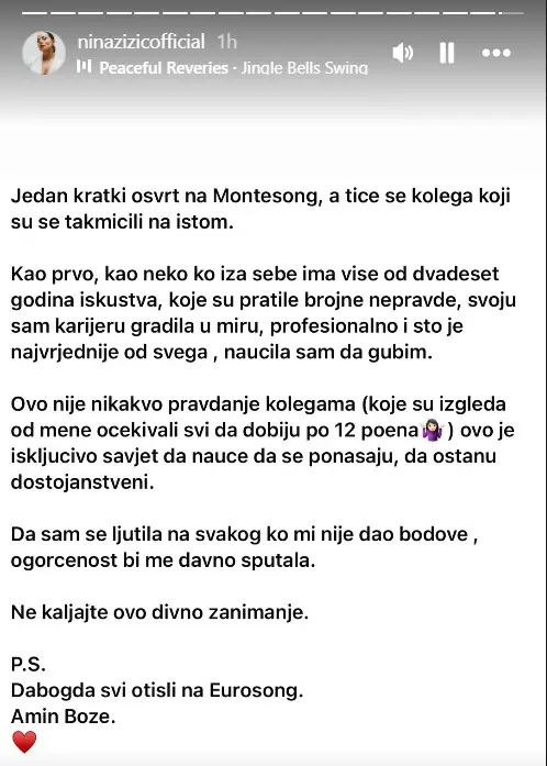 "Jedan kratak osvrt na Montesong, a tiče se kolega koji su se takmičili na istom. Kao prvo, kao neko ko iza sebe ima više od 20 godina iskustva, koje su pratile brojne nepravde, svoju sam karijeru gradila u miru, profesionalno i što je najvrednije od svega, naučila sam da gubim. Ovo nije nikakvo pravdanje kolegama (koje su izgleda od mene očekivali svi da dobiju po 12 poena). Ovo je isključivo savet da nauče da se ponašaju, da ostanu dostojanstveni", poručila je ona, a onda dodala: