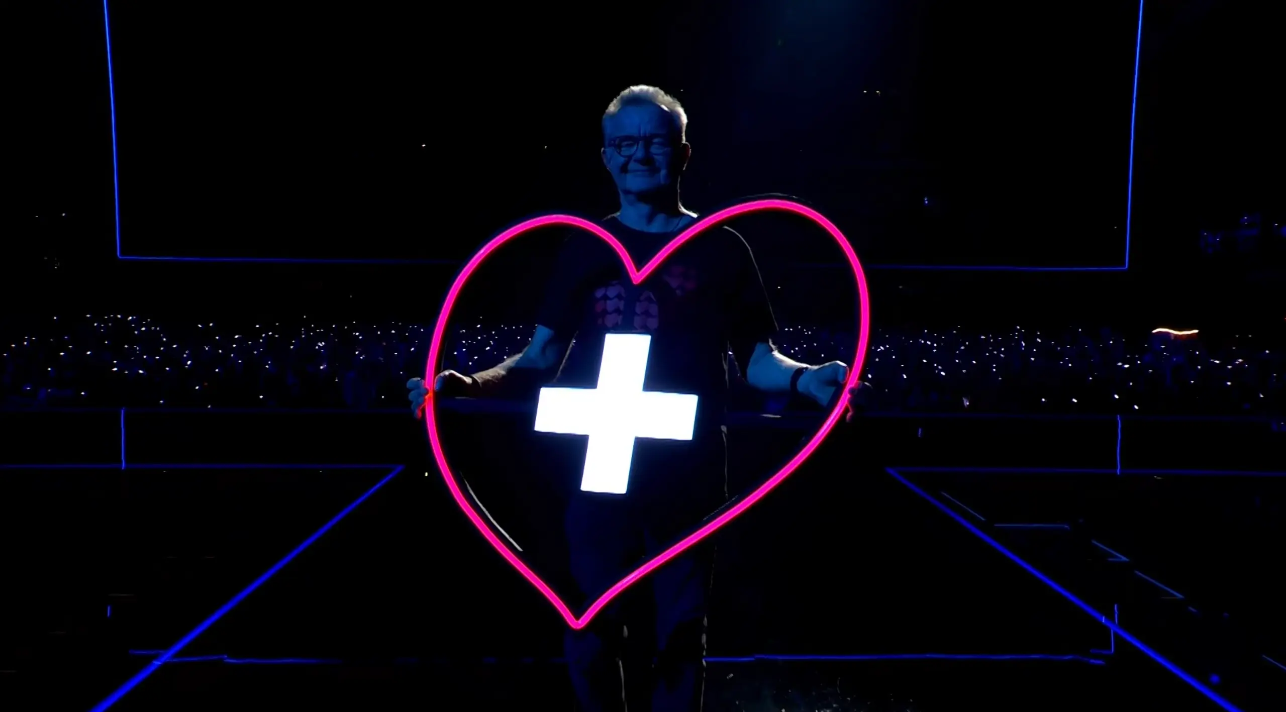 On se popeo na binu i postavio veliko srce i time "oživeo" scenu i osvetleo put večerašnjim takmičarima.