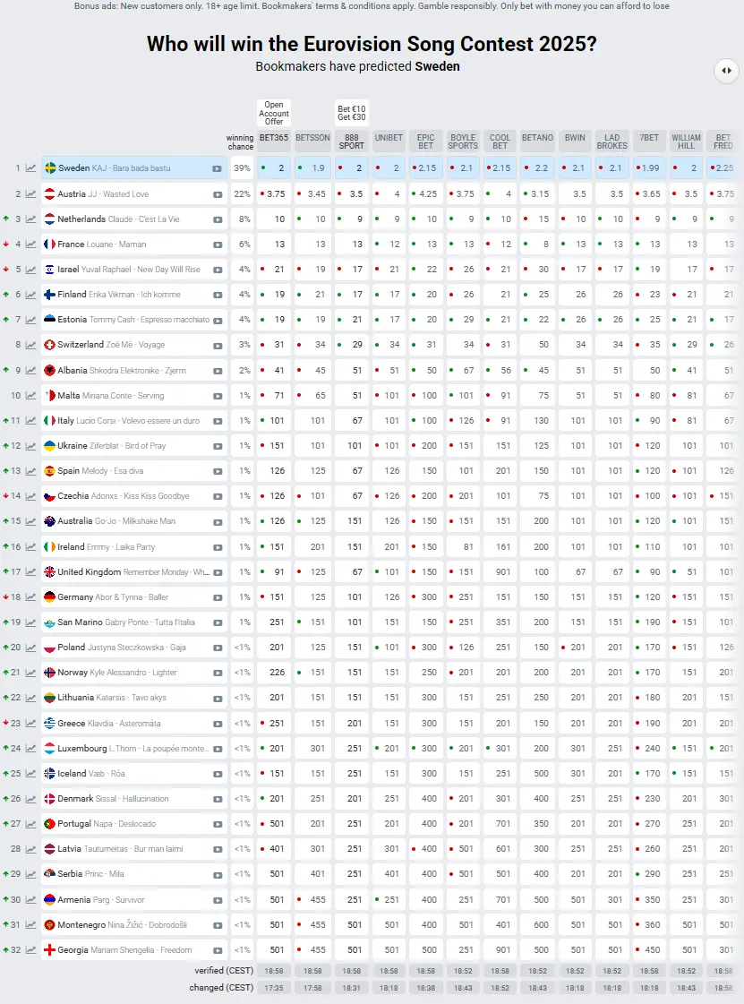 Svakako, kladionice mogu da pogreše, kao što je to bio slučaj u prvoj polufinalnoj večeri. Tada su, naime, kladionice predviđale prolazak Portugalu, ali je umesto njih prošao Island. To je, doduše, jedina greška koju su kladionice napravile, a nadamo se da će takav slučaj biti i sa predstavnikom Srbije.