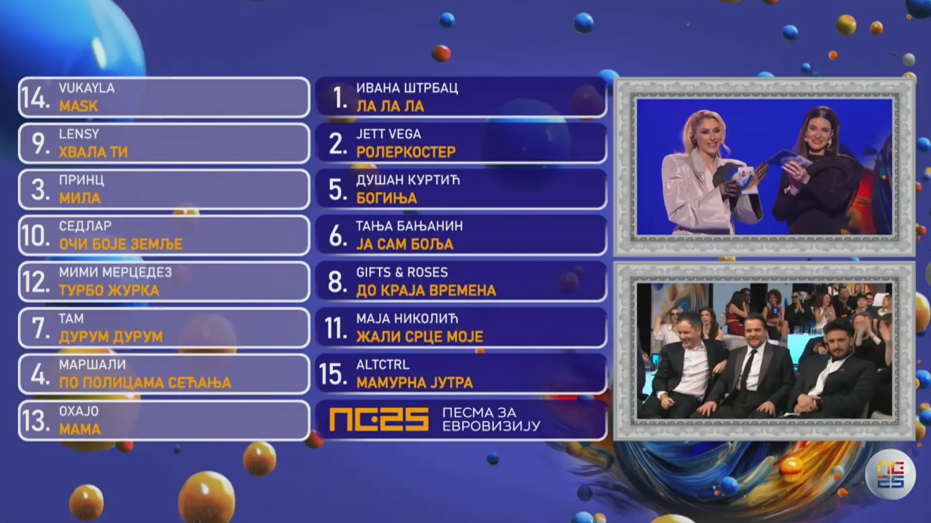 Foto: RTS PrintscreenDrugo polufinalno veče "Pesme za Evroviziju '25" upravo je završeno, a voditeljke Dragana Kosjerina Perduv i Kristina Radenković saopštile su gledaocima ko su novih osam finalista.
