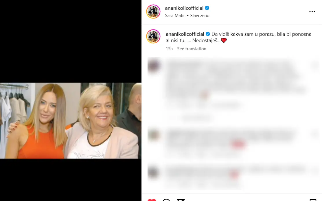 "Da vidiš kakva sam u porazu, bila bi ponosna al' nisi tu. Nedostaješ...", napisala je Ana koju su posle Marinine smrti 2021. godine snašle brojne životne nedaće.