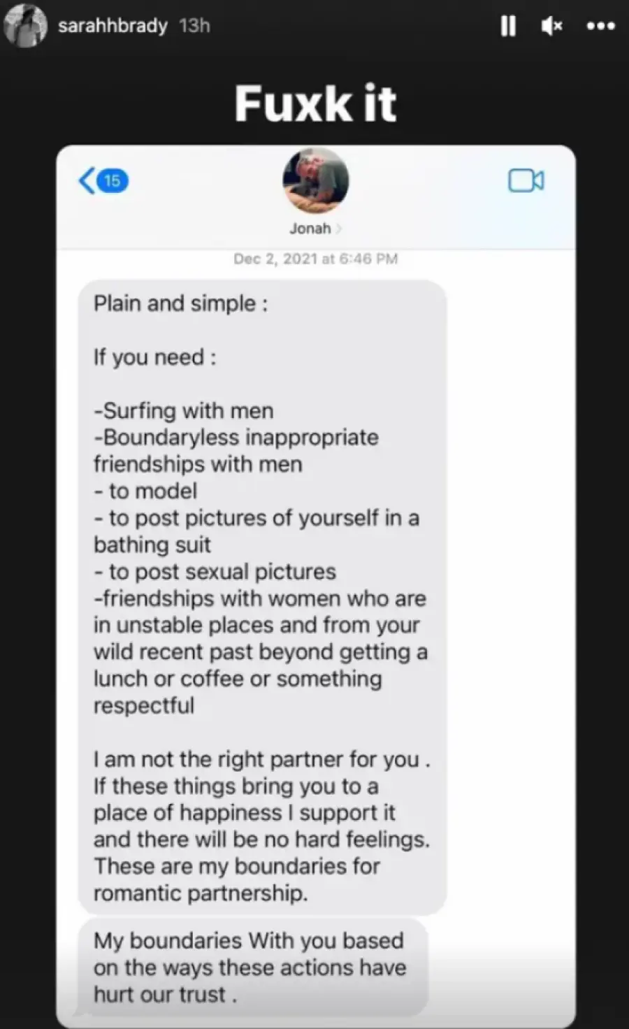 "Prosto i jednostavno, ako ti treba da surfuješ sa muškarcima, imaš neprikladna prijateljstva sa njima, da budeš model, da se slikaš u kupaćem, da objavljuješ seksualizovane fotografije i družis se sa ženama koje nisu na dobrom putu, onda ja nisam partner za tebe", napisao je, navodno, Džona njoj, pa dodao: