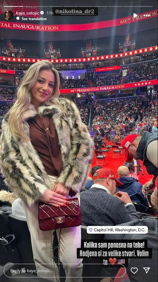 Foto: Instagram/PrintScreen/kaya_ostojicInauguracija Donalda Trampa održala se sinoć u Vašingtonu, kada je on i zvanično postao 47. predsednik Sjedinjenih Američkih Država, a na malim ekranima širom sveta mogla je da se vidi u prvim redovima i jedna mlada Srpkinja.