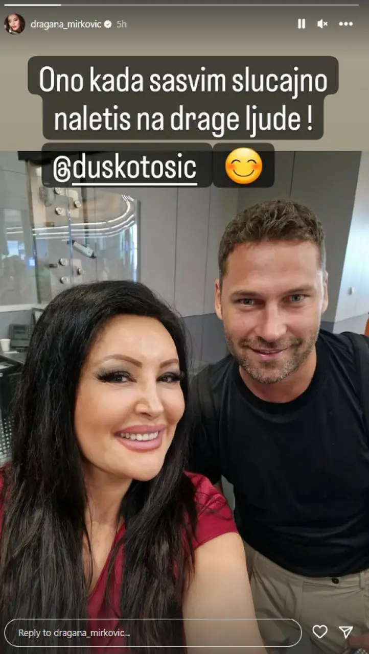 "Ono kad sasvim slučajno naletiš na drage ljude", napisala je Mirkovićeva uz fotografiju sa Duškom, dok osmehe sa lica nisu skidali.