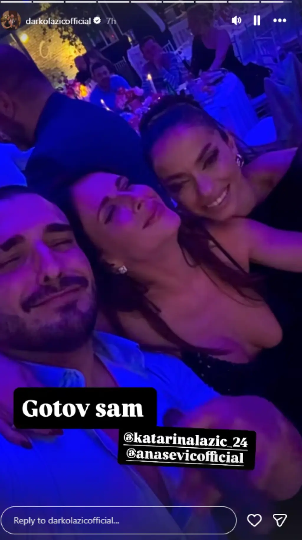 U jednom momentu Ana i Darko su zapevali zagrljeni, a nešto kasnije im se pridružila i Katarina. Darko je fotografiju sa bivšom i sadašnjom suprugom prokomentarisao rečima: "Gotov sam".