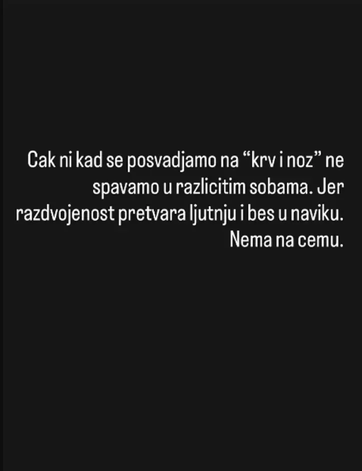 "Čak ni kada se posvađamo na "krv i nož" ne spavamo u različitim sobama jer razdvojenost se pretvara u ljutnju, bes i naviku. Nema na čemu", napisala je ona na svom Instagram profilu.
