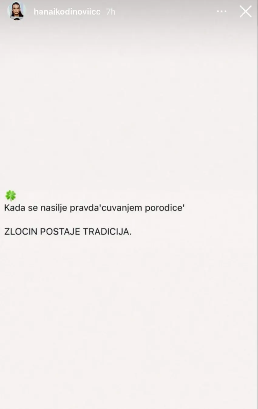 "Kada se nasilje pravda "čuvanjem porodice" zločin postaje tradicija", piše u objavi koju je podelila Hana Ikodinović.