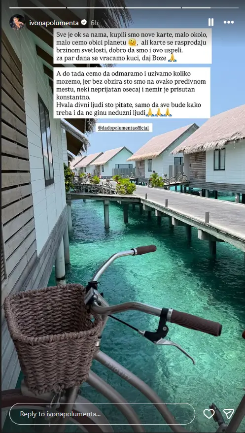 "Sve je okej sa nama, kupili smo nove karte, malo okolo, malo ćemo obići planetu, ali karte se rasprodaju brzinom svetlosti, dobro da smo i ovo uspeli. Za par dana se vraćamo kući, daj Bože", napisala je Ivona Polumenta i dodala: