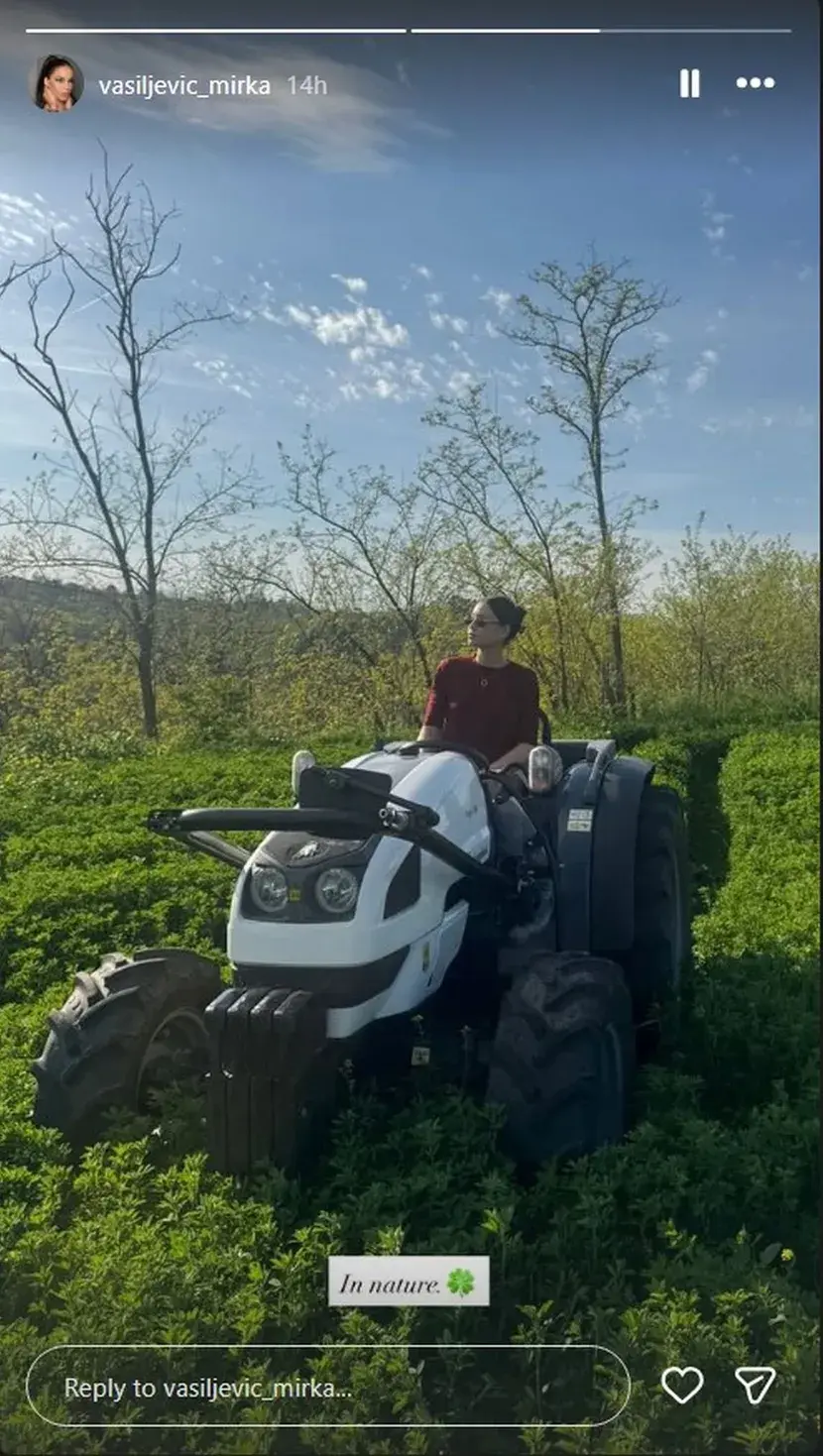 Ono što je posebno privuklo pažnju na njenoj najnovijoj objavi jeste pomalo neočekivan, ali izuzetno luksuzan detalj u prirodnom ambijentu. Mirka je podelila fotografiju na kojoj se vidi kako uživa okružena bujnim zelenilom, dok sedi ni manje ni više nego na preskupom traktoru poznate marke "Lambordžini".