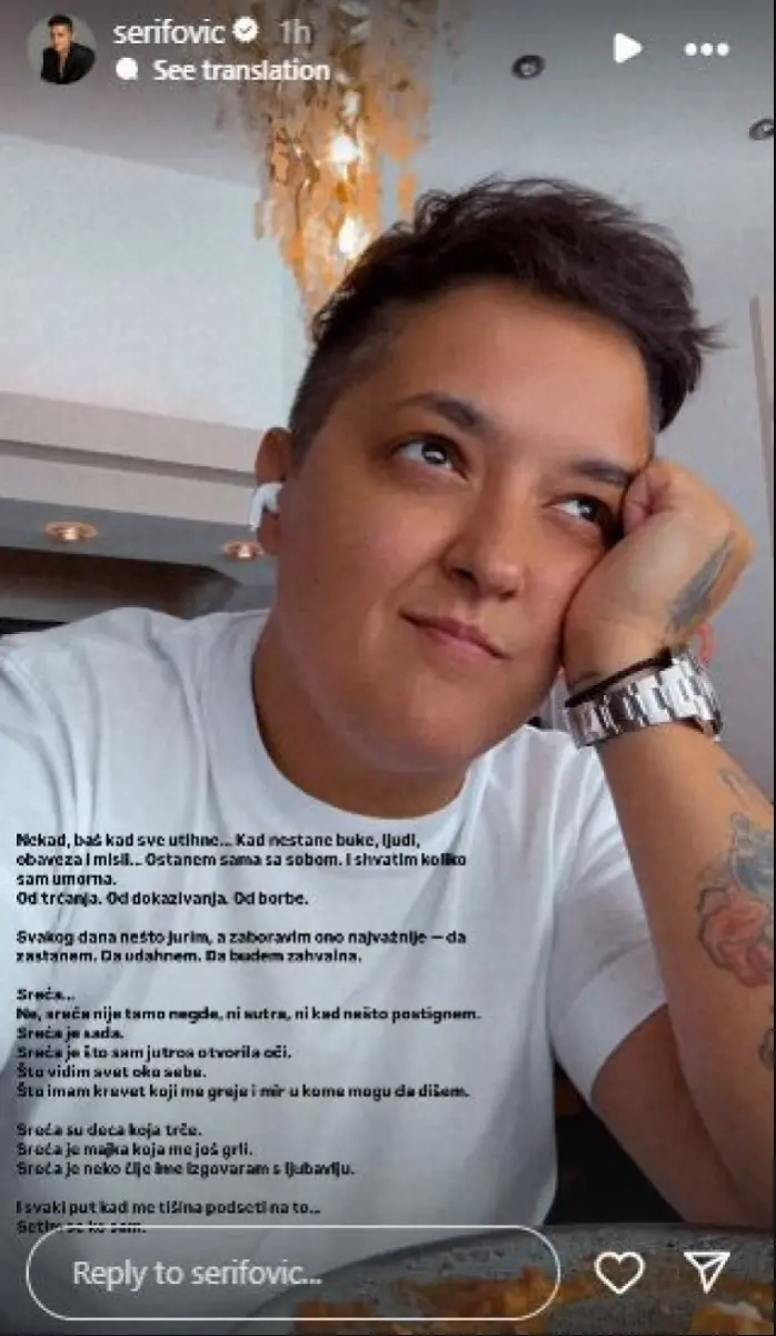 "Sreća su deca koja trče. Sreća je majka koja me još grli. Sreća je neko čije ime izgovaram s ljubavlju. I svaki put kad me tišina podseti na to... Setim se ko sam", zaključila se tek onda Šerifovićeva, pa zasigurno i izmamila razne reakcije svojih fanova.