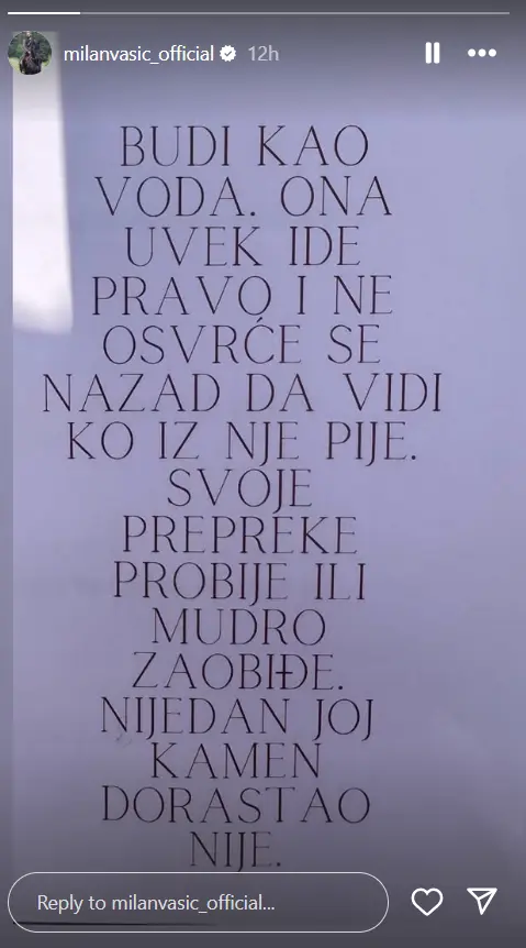 "Budi kao voda, ona uvek ide pravo i ne osvrće se nazad da vidi ko je iz nje pije. Svoje prepreke probija ili mudro zaobiđe. Nijedan joj kamen dorastao nije, napisao je Milan Vasić na svom Instagramu."