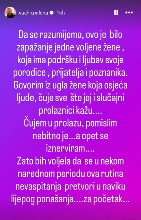 "Da se razumemo, ovo je bilo zapažanje jedne voljene žene, koja ima podršku i ljubav svoje porodice, prijatelja i poznanika. Govorim iz ugla žene koja oseća ljude, čuje sve što joj i slučajni prolaznici kažu... Čujem u prolazu, pomislim nebitno je, a opet se iznerviram", poručila je Milena.