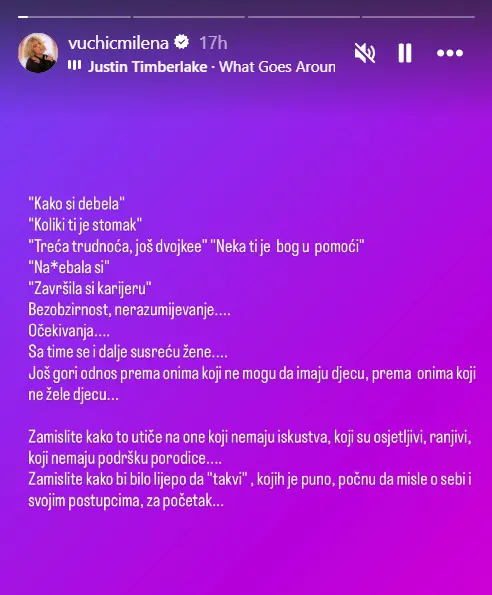 "Kako si debela, koliki ti je stomak, treća trudnoća, još dvojke, neka ti je Bog u pomoći... Naje*ala si, završila si karijeru... Bezobzirnost, nerazumevanje, očekivanja... Sa time se i dalje susreću žene... Još gori odnos prema onima koji ne mogu da imaju decu, prema onima koji ne žele decu", napisala je pevačica.