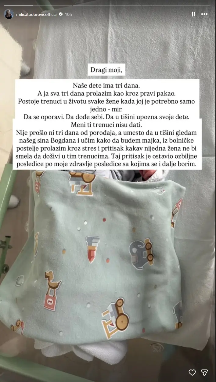 "Naše dete ima tri dana, a ja ta tri dana prolazim kroz pravi pakao. Umesto da u tišini upoznajem svog sina i učim kako da budem majka, suočavam se sa stresom i pritiscima koji su ostavili posledice po moje zdravlje", poručila je pevačica.