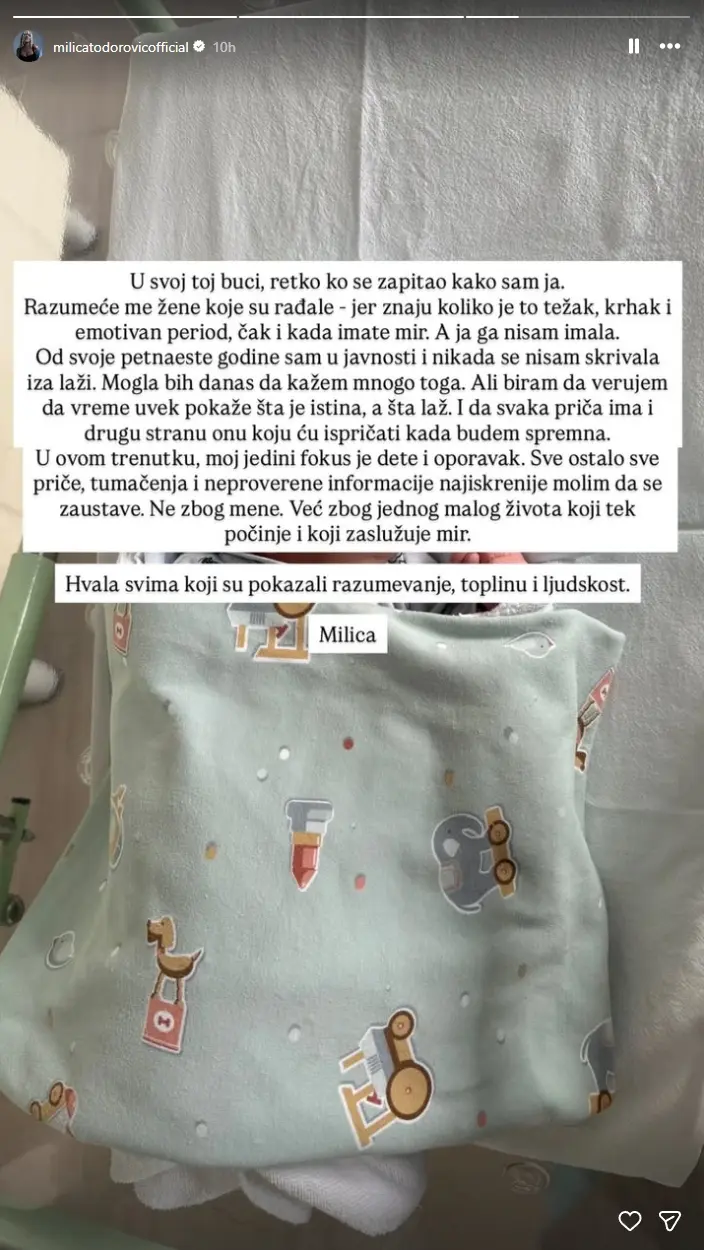 "Molim da se sve priče prekinu zbog jednog malog života koji tek počinje i zaslužuje mir", zaključila je Milica, zahvalivši se svima koji su joj pružili podršku.