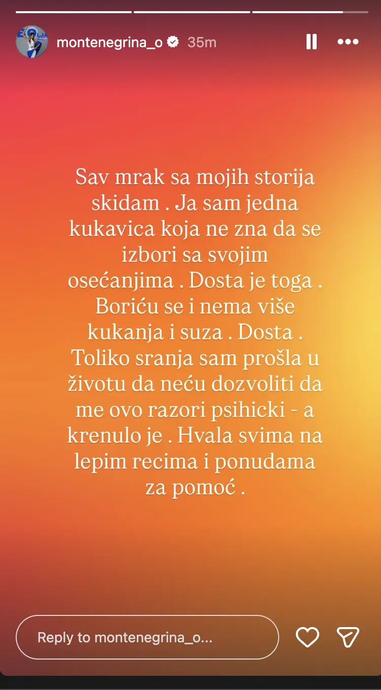 "Sav mrak sa mojih storija skidam. Ja sam jedna kukavica koja ne zna da se izbori sa svojim osećanjima. Boriću se i nema više kukanja i suza. Dosta. Toliko s*anja sam prošla u životu da neću dozvoliti da me ovo razori psihički, a krenulo je. Hvala svima na lepim rečima i ponudama za pomoć", napisala je ona.