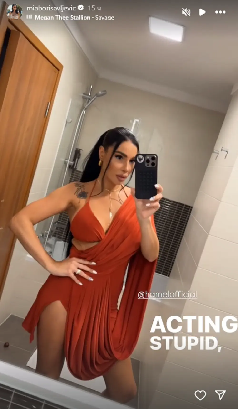 Ona je za rođendansku proslavu obukla haljinu kojom je privukla veliku pažnju. Naime, Mia je obukla haljinu na jedno rame ispod koje joj se video brus u istoj boji, a pored toga i sa dubokim šlicem.