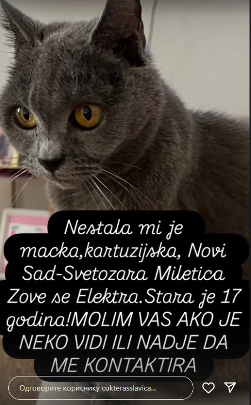 "Nestala mi je mačka, kartuzijska, Novi Sad Svetozara Miletića. Zove se Elektra. Stara je 17 godina. Molim vas ako je neko vidi ili je nađe, da me kontaktira", napisala je uspeničena Slavica.