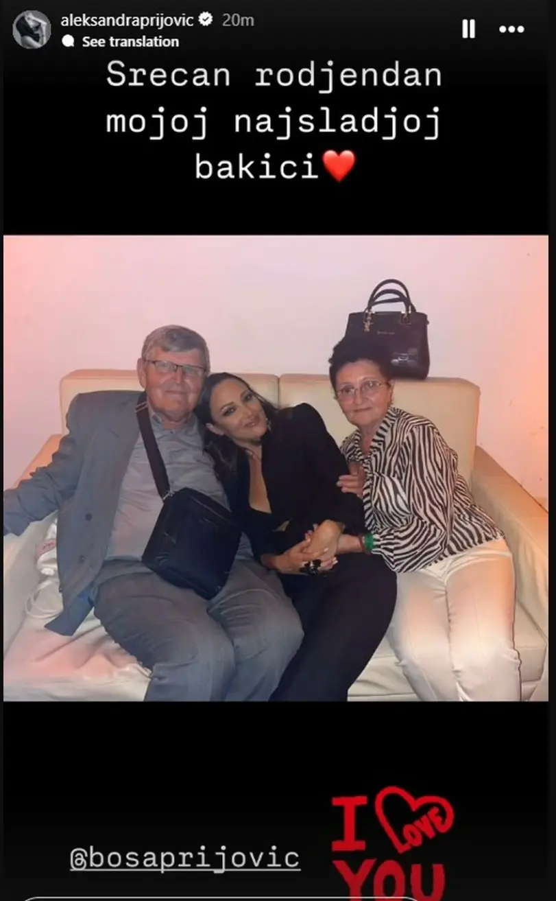 "Jedna od najemotivnijih pesama koje sam snimila. Ovu pesmu ću da posvetim baki i deki. Bako i deko, maštala sam o tome da vi jednog dana ovde budete sa mnom i da vam ispunim ovu želju. Samo sam htela da doživite ovo. Volim vas najviše na svetu", reči su kojima se Aleksandra Prijović tokom koncerta u Areni u Beogradu obratila baki Bosi i deda Đuri.