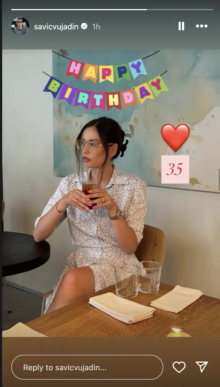 Naime, nema sumnje da se danas u domu Mirke i Vujadina sprema prava fešta povodom njenog rođendana, a fudbaler je na svom Instagram profilu podelio fotografiju svoje supruge na kojoj je na engleskom bilo ispisano: "Srećan rođendan", crveno srce i broj 35.