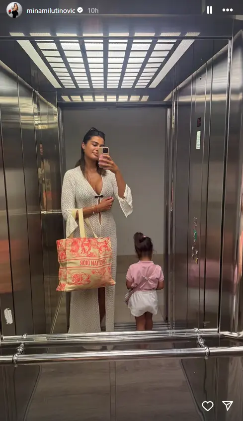 Ona je sada na storiju podelila fotografiju pre odlaska na plažu, gde se uslikala u liftu sa ćerkom Talijom. Mina je pozirala u privodnoj haljini ispod koje se nazire kupaći, dok su njene grudi došle u prvi plan, piše Blic.