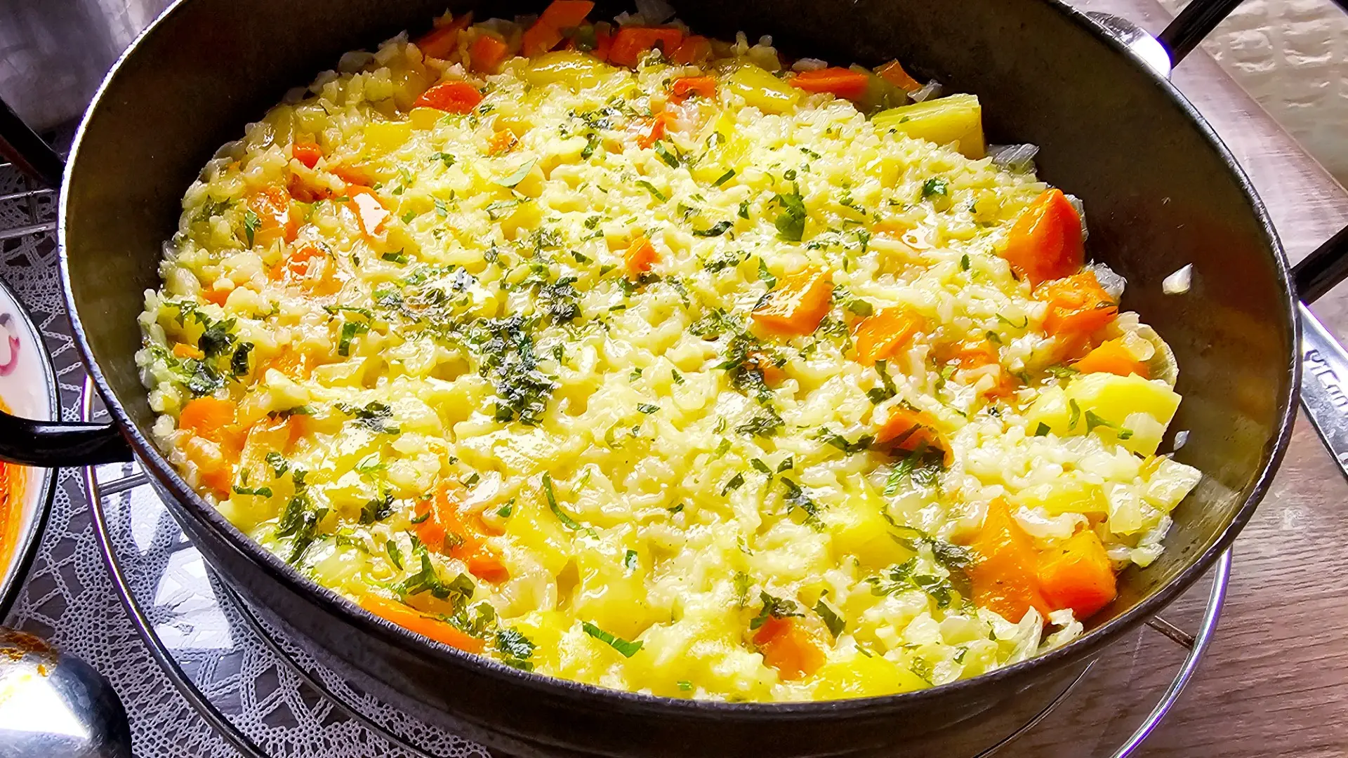 Izdinstati luk na ulju i šargarepu, pa dodati krompir i opran pirinač. Ubaciti suvi začin, mleveni biber i preliti vodom i kuvati 30 minuta na tihoj vatri da se pirinač skuva.