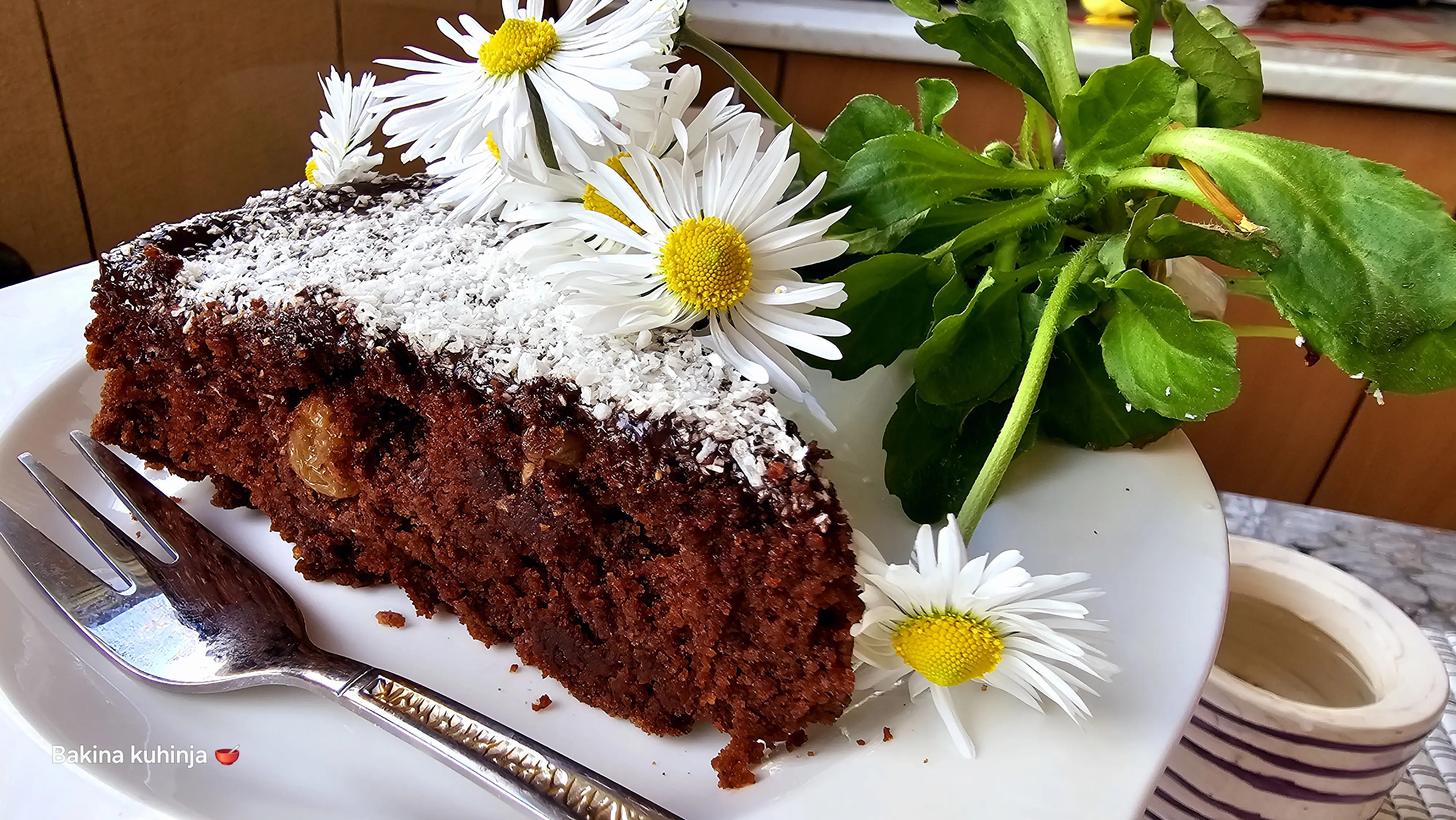 Peći na 180 stepeni C, 50 minuta. Odozgo ide preliv čokolade posut sa kokosom.