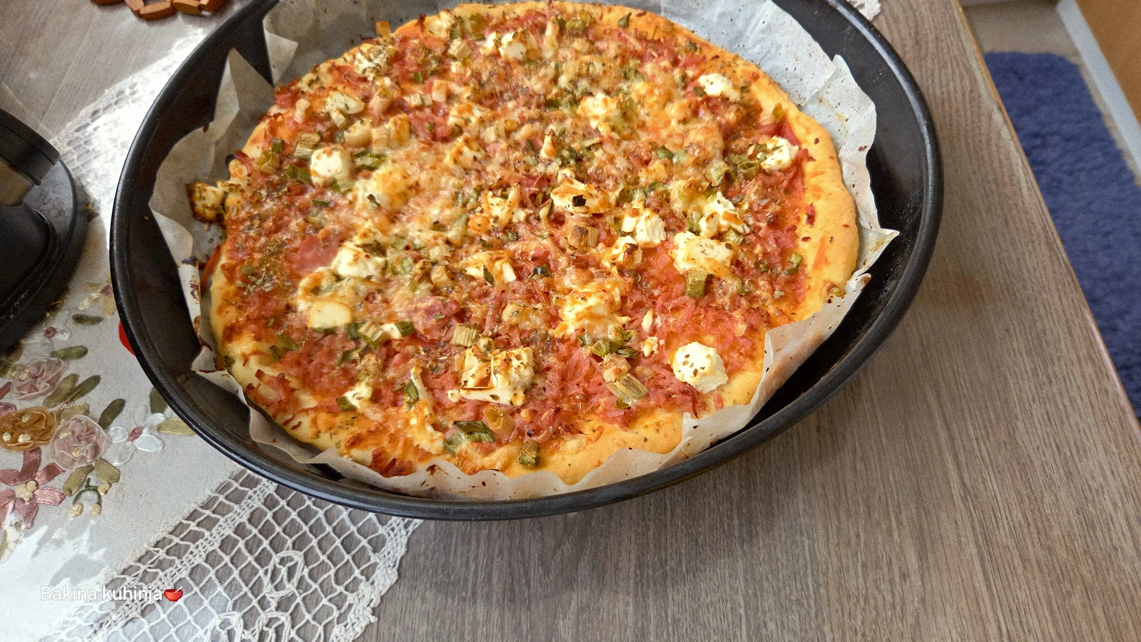 Preko testa obilno naneti kečap, pa rasporediti rendanu šunku i seckani sir. Dodati sitno seckan mladi luk i sve završiti slojem kačkavalja i origanom. Peći na 220 stepeni C oko 20 do 30 minuta.