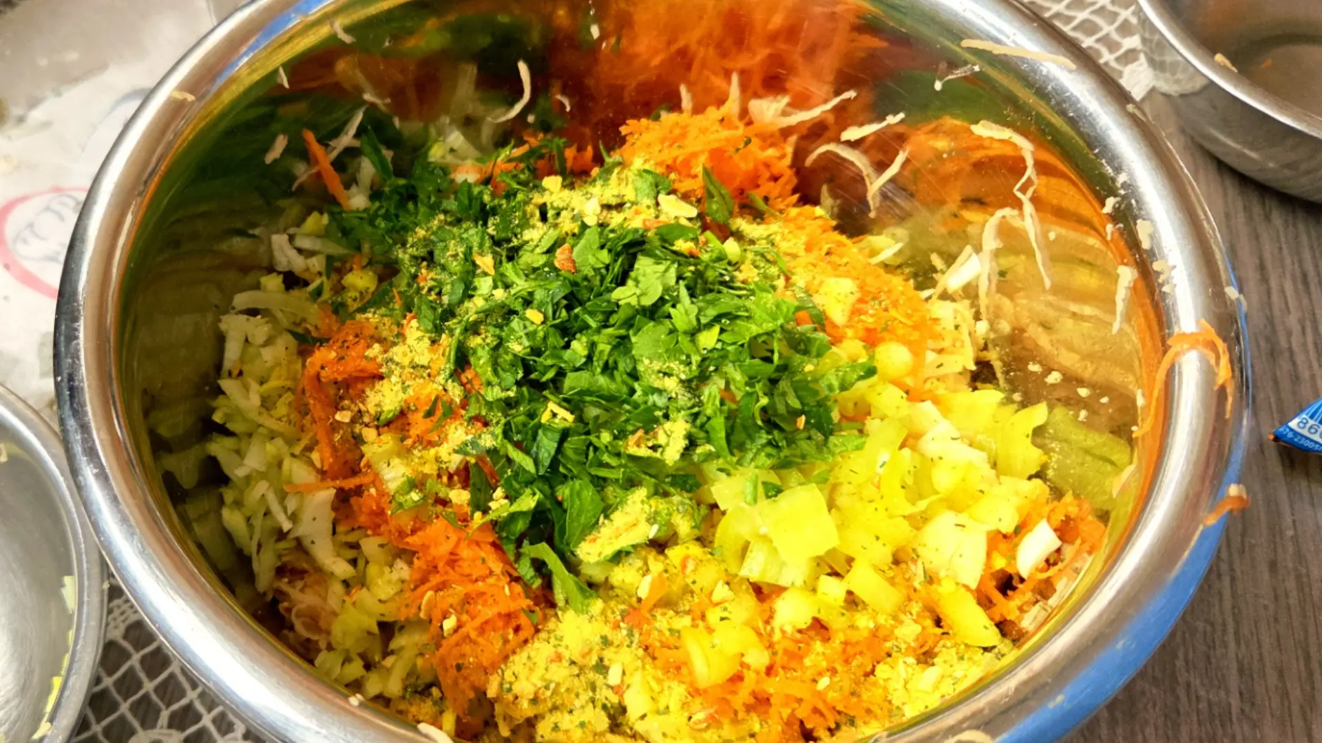 Dodati sitno seckan crni luk i beli luk seckan na komadiće da se oseća pod zubom, a zatim umešati integralno brašno, prezle, mrvicu praška za pecivo i začine.
