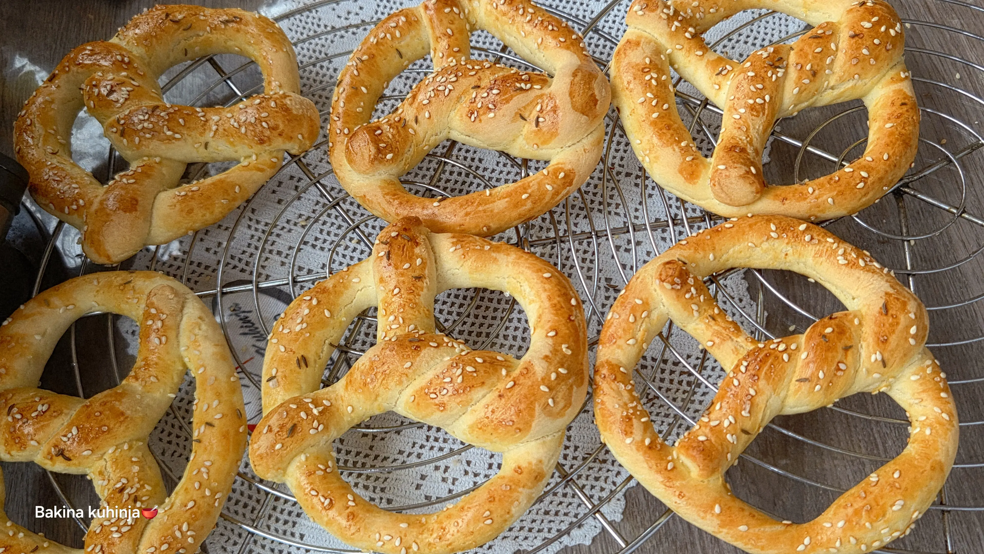 Od drugog dela oblikujte veknu, poređajte sve u podmazan pleh, a perice poprskajte vodom i uvaljajte u susam pospite krupnom solju i još nekom semenkom odozgo pa pecite dok ne porumeni.