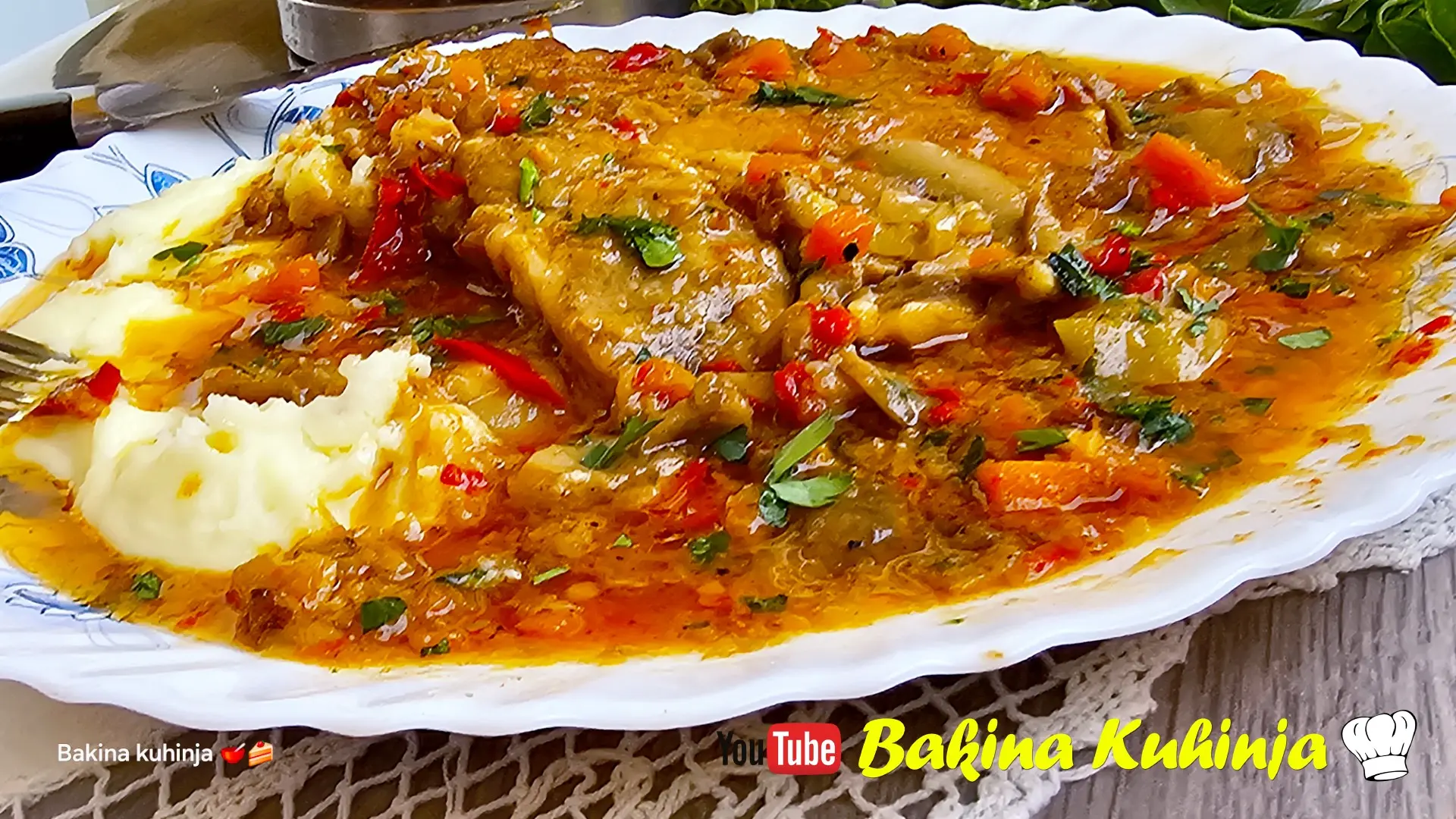 Dodati začin, mleveni biber i na kraju peršunov list seckan. Servirati uz krompir pire ili kuvani pirinač.
