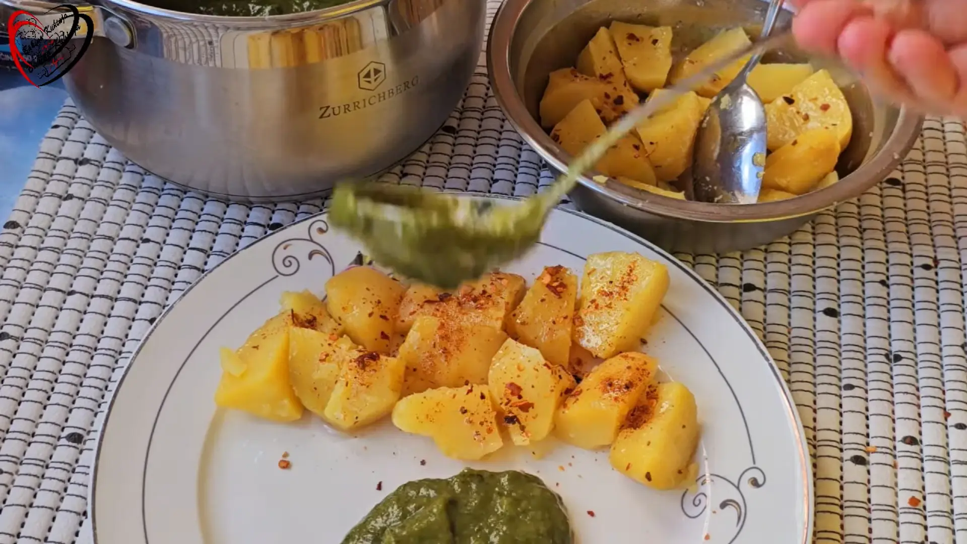 Uz spanać obariti sitniji krompi pa kad je kuvan oguliti iseći na koce. Posoliti krupnom solju i ljutom tucanom paprikom po želji i služiti uz spanać.