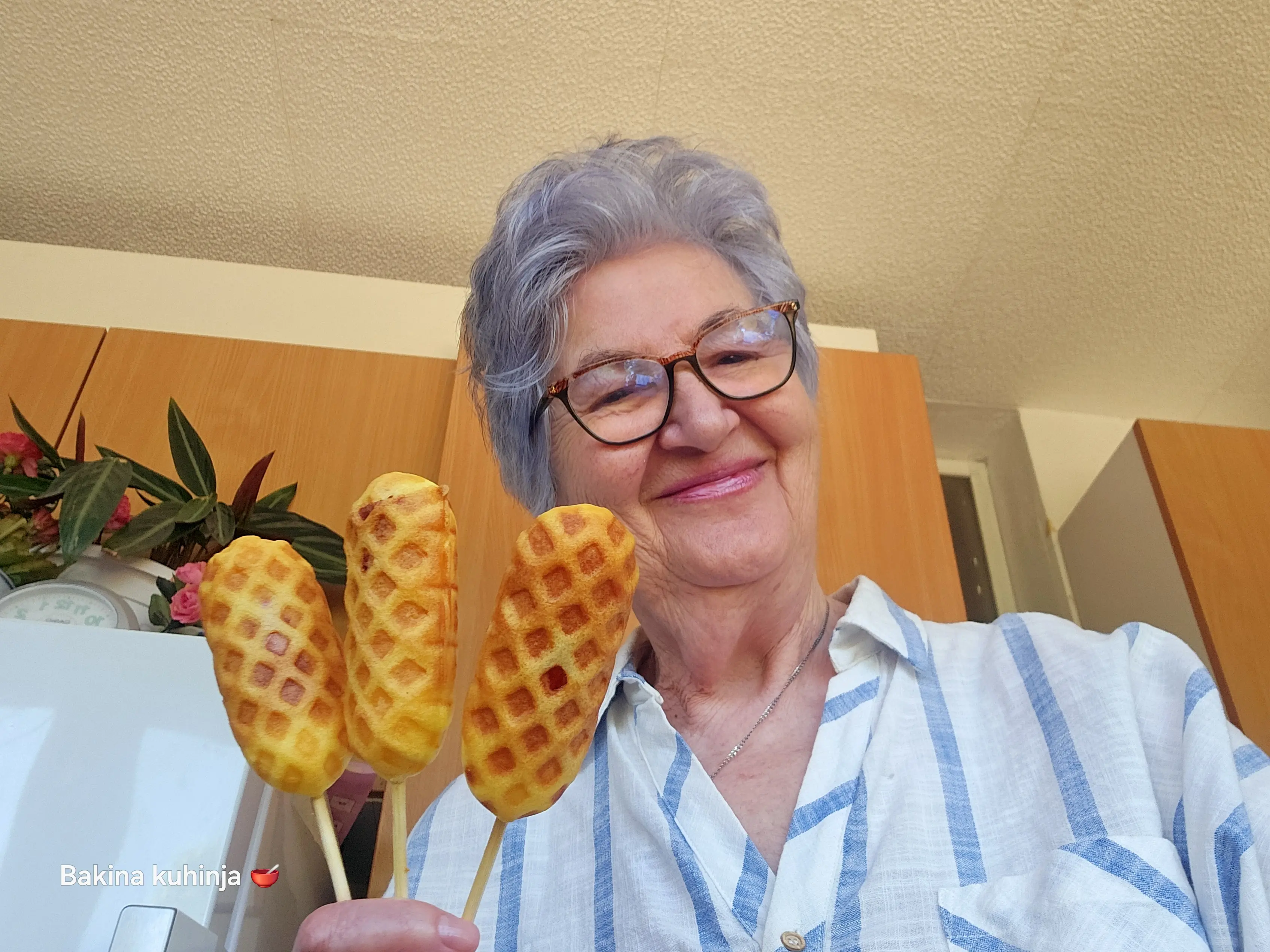Viršlu uvaljati u testo, staviti u aparat i štapić staviti u kalup. Sipati na viršlu još testa da se izravna rupa. Tako sve do kraja. Poklopiti ugrejan aparat. Posle 7-8 minuta naš bakin kolač je rumen. Ako želimo slatko u testo dodati vanilin šećer i malo šećera.