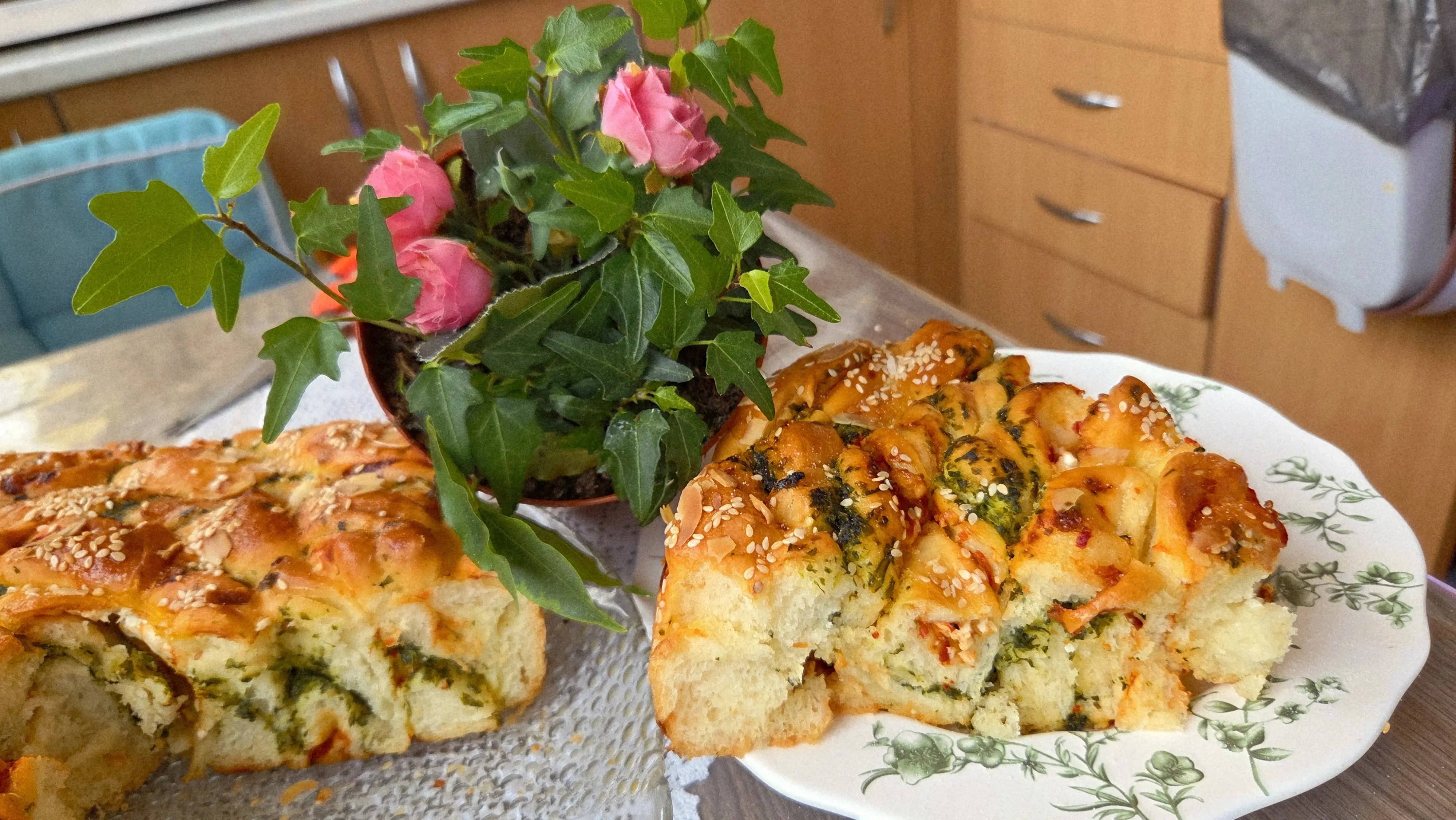 Sve zajedno rukama malo razvucite, pa secite trake širine oko 1,5 prst od gore na dole. Trake presecite na pola, svaku uvijte oko svoje ose i ređajte u krug u podmazan pleh. Ostavite da malo poraste pa premažite žumancetom i pospite susamom.