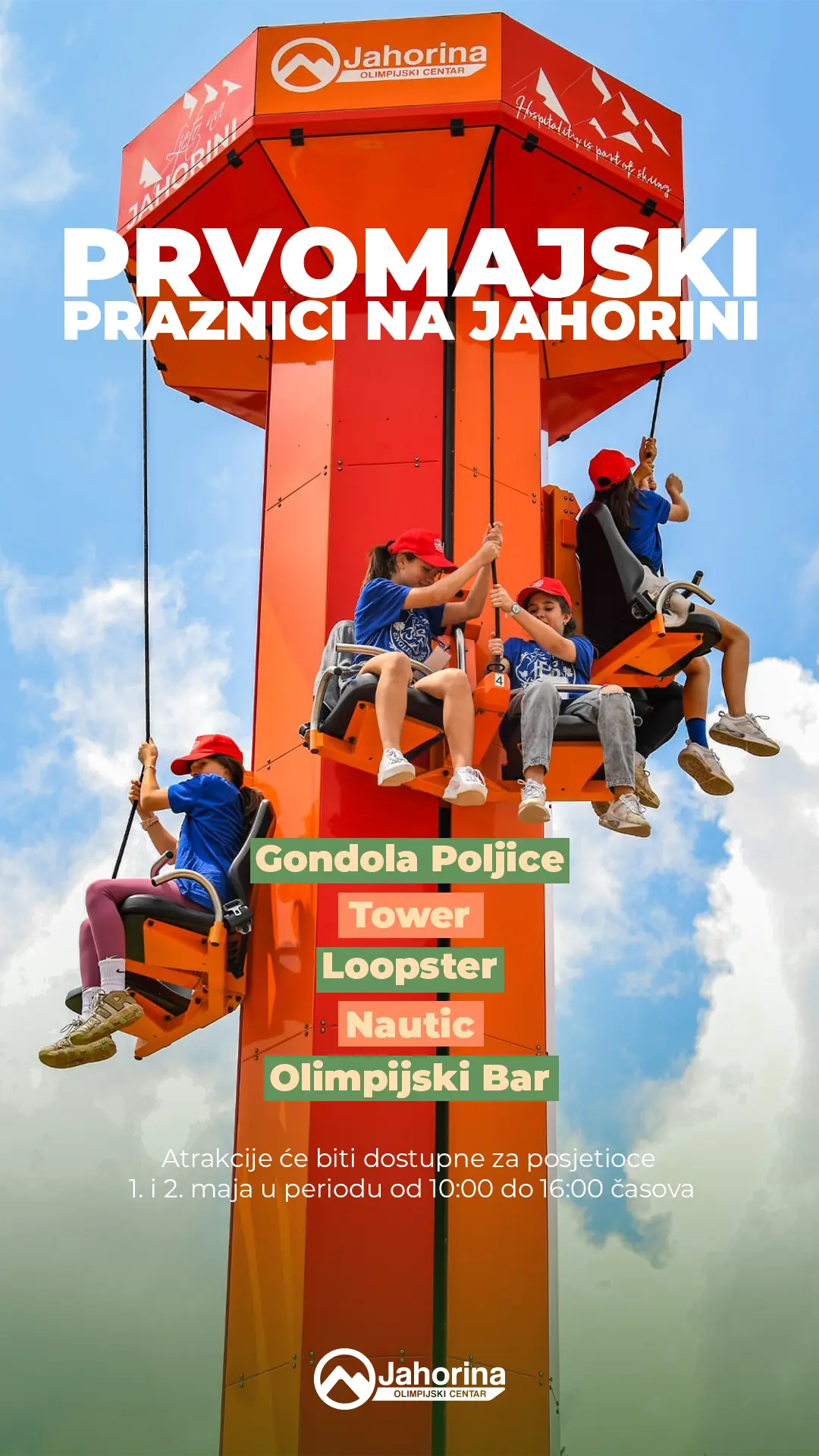 Jahorina poziva sve ljubitelje prirode, avanture i planinskog vazduha - u periodu prvomajskih praznika, 1. i 2. maja, od 10:00 do 16:00 časova, kada će na raspolaganju biti omiljene atrakcije: gondola Poljice, Tower, Loopster, Nautic Jet i Olimpijski bar.