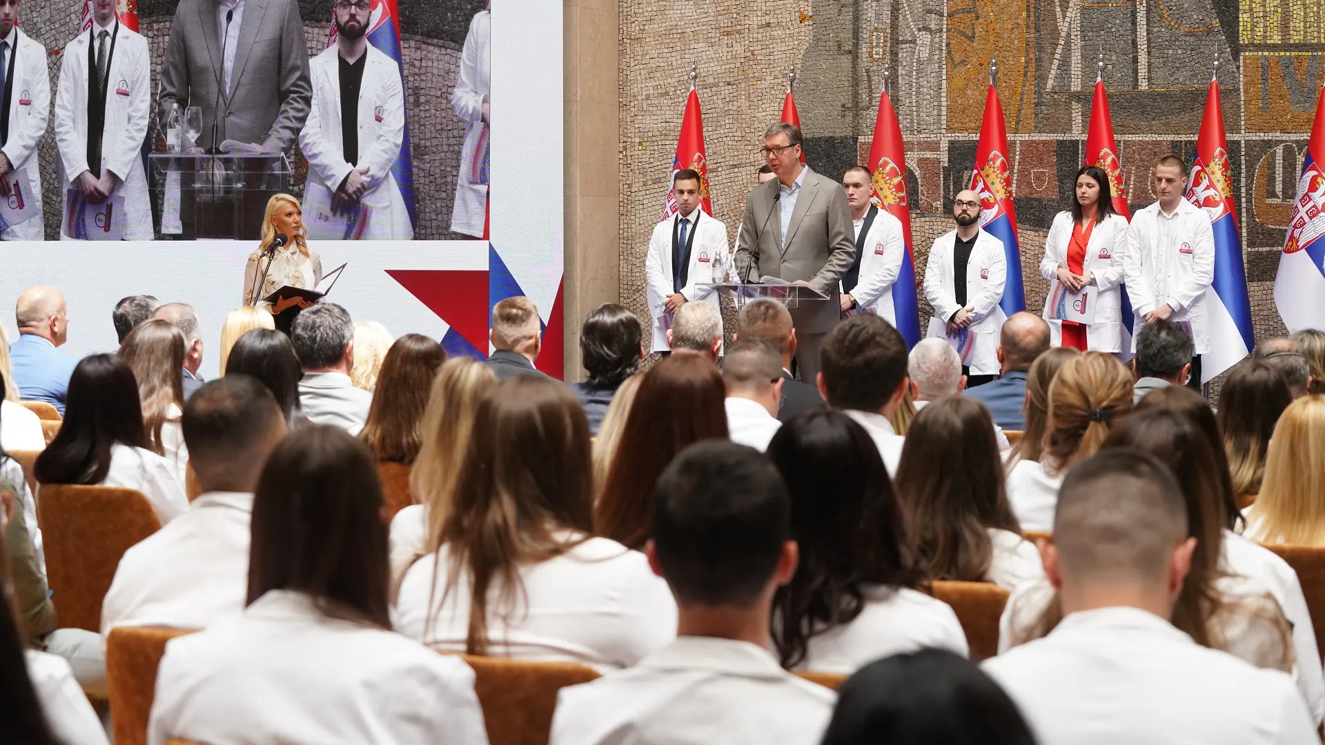 Vučić je izjavio da je država ponosna na najbolje diplomce medicinskih fakulteta i srednjih medicinskih škola i istakao da će uvek u životu morati da budu najbolji kao tokom školovanja. On je naveo da su najbolji diplomci iz oblasti medicine dobili priliku odmah da rade u svojoj zemlji i da imaju vrlo pristojnu platu koja će i dalje samo da raste, istakavši da lekovi mogu da izleče bolesti, ali samo lekari mogu da izleče pacijenta i ljude.