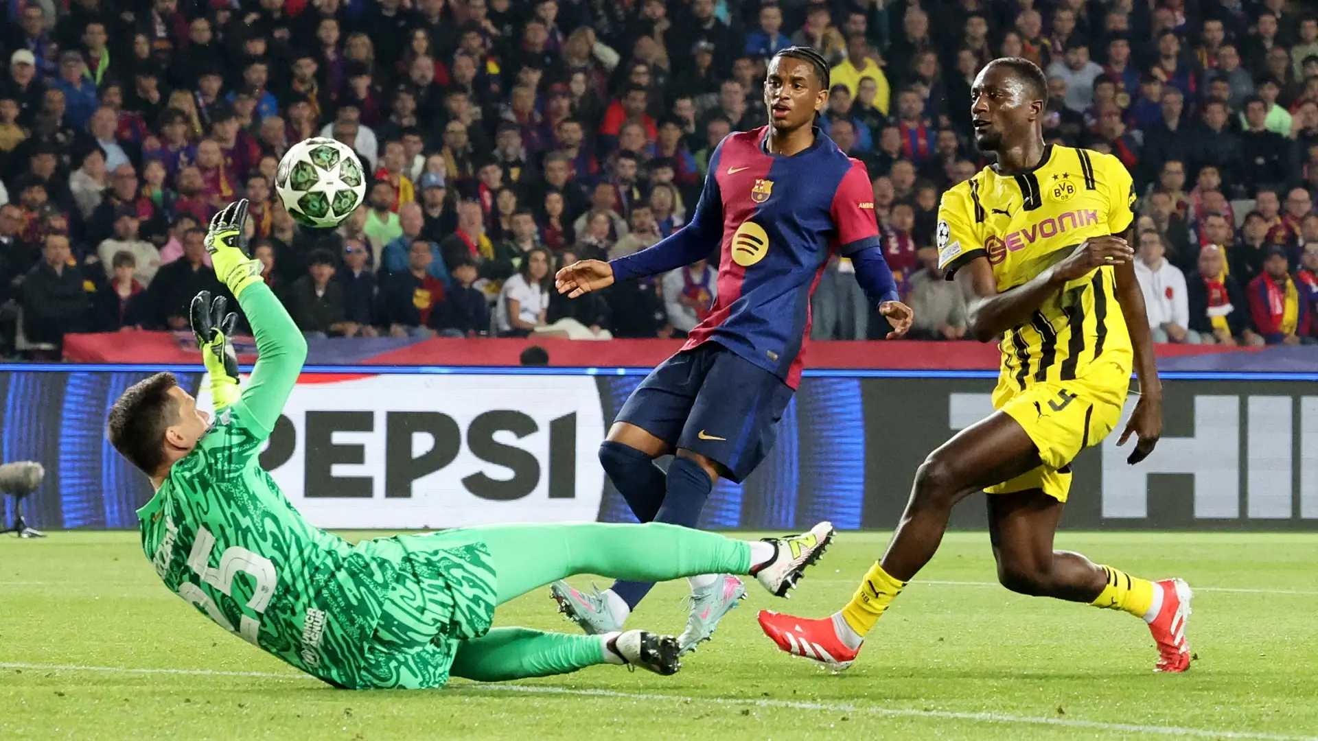 Zaista silovito su krenuli domaći, i već u petom minutu zapretio je Lamin Jamal, kada je primio loptu, namestio se i opalio, ali Kobel bio koncentrisan.
