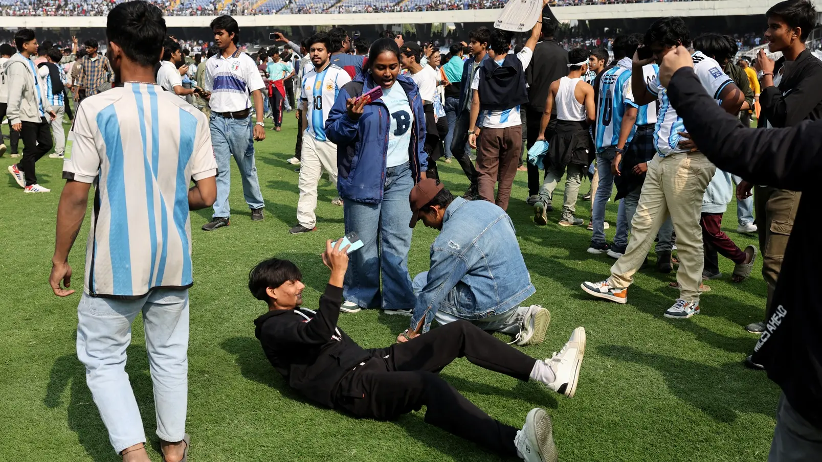Foto: REUTERSNavijači u Indiji izazvali su nerede na stadionu Solt Lejk u Kalkuti, bacajući sedišta i druge predmete na teren tokom posete argentinskog fudbalera Lionela Mesija, nezadovoljni što nisu mogli da mu priđu bliže i da ga bolje vide, prenela je agencija ANI.