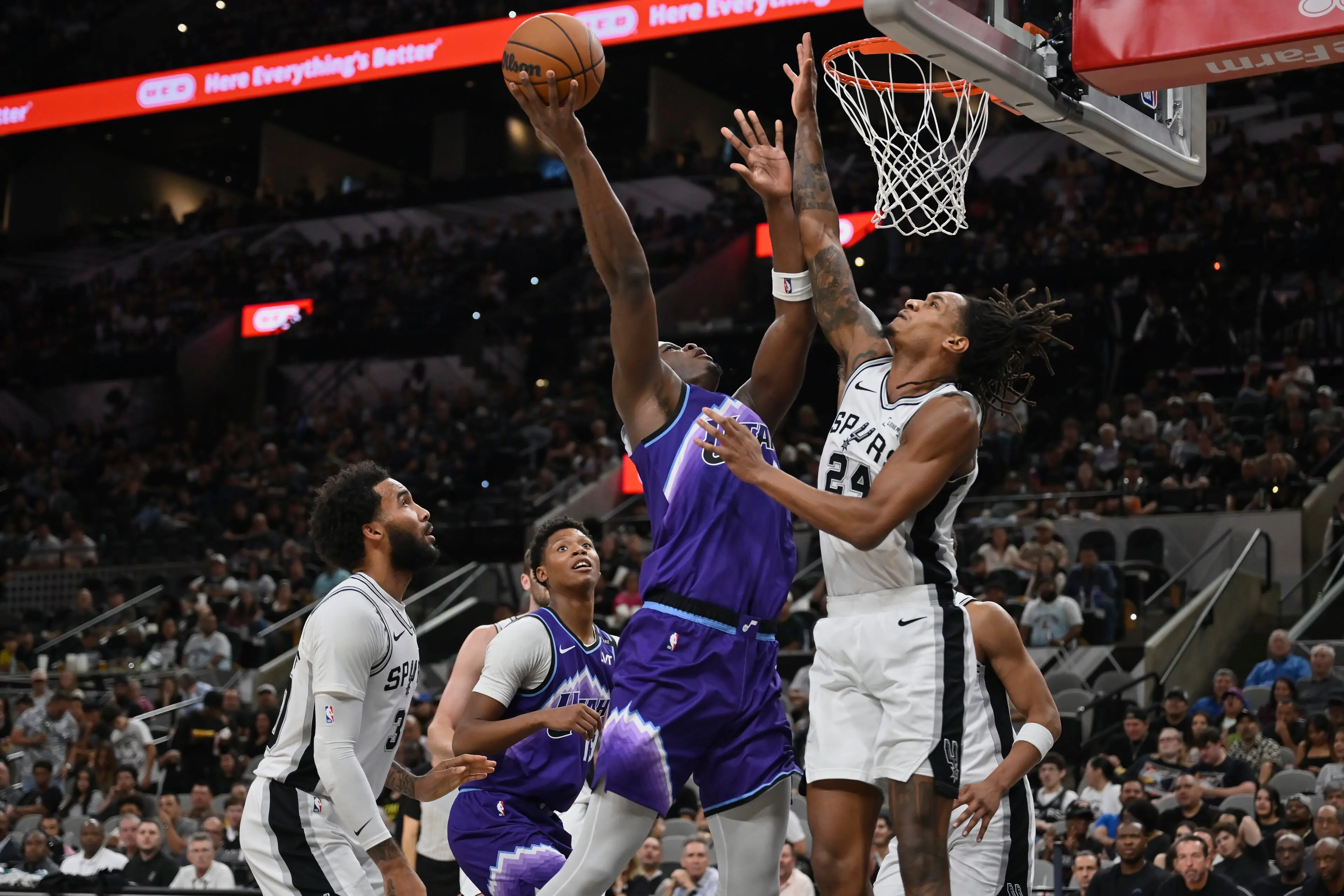 Košarkaši San Antonija savladali su posle produžetka na svom terenu Jutu 134:130. U pobedničkoj ekipi najbolji je bio Viktor Vembanjama koji je zabeležio 22 poena, sedam skokova i tri asistencije.