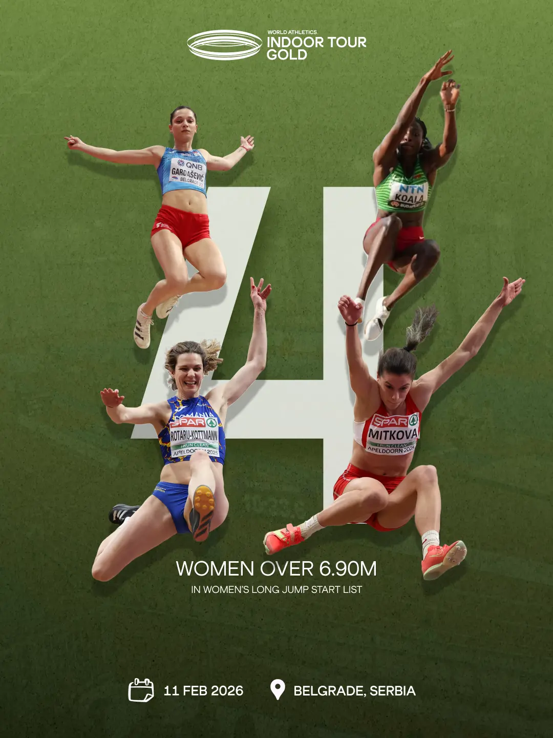 Skakačice udalj, uvek atraktivne, brze, precizne i bogate eksplozivnom snagom. I ove godine oči gledalaca biće upravo usmerene na ono što će akterke ove atletske discipline činiti u dvorani u Beogradu u okviru jednog od najvećih dvoranskih mitinga u svetu. Na listi učesnica nalaze se i četiri šampionke koje iza sebe imaju skok koji prelazi 6,90m, među njima i srpska šampionka Milica Gardašević.