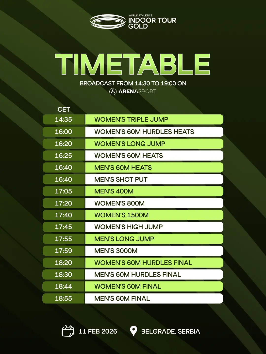 U Atletskoj dvorani na Banjici 11. februara 2026. sa početkom u 14.30 časova, krem svetske atletike na startu sezone u kojoj mnogi očekuju mnogo i vredno su radili kako bi stigli do svojih snova i ciljeva, a to au rekordi na atletskim borilištima.