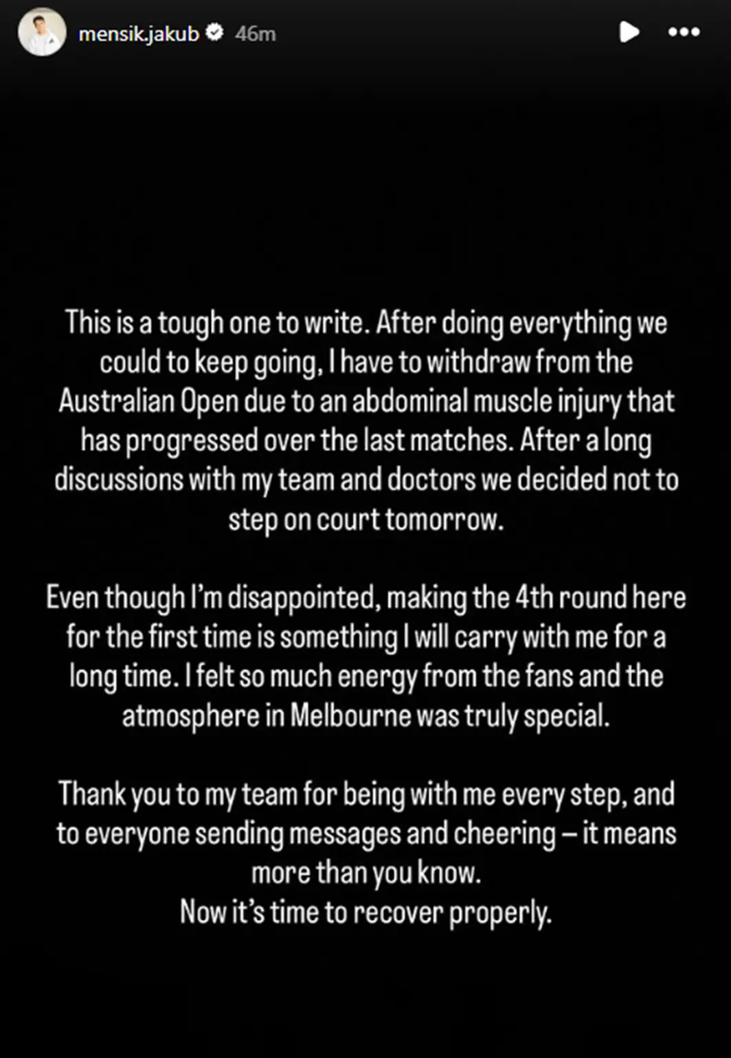 "Ovo je teško napisati. Nakon što smo uradili sve što smo mogli da nastavimo dalje, moram da se povučem sa Australijan opena zbog povrede trbušnog mišića koja se pogoršavala tokom poslednjih mečeva. Posle dugih razgovora sa mojim timom i doktorima, doneli smo odluku da sutra ne izađem na teren. Iako sam razočaran, plasman u četvrto kolo ovde po prvi put je nešto što ću dugo nositi sa sobom. Osetio sam ogromnu energiju publike, a atmosfera u Melburnu bila je zaista posebna", napisao je Menšik na Instagramu.