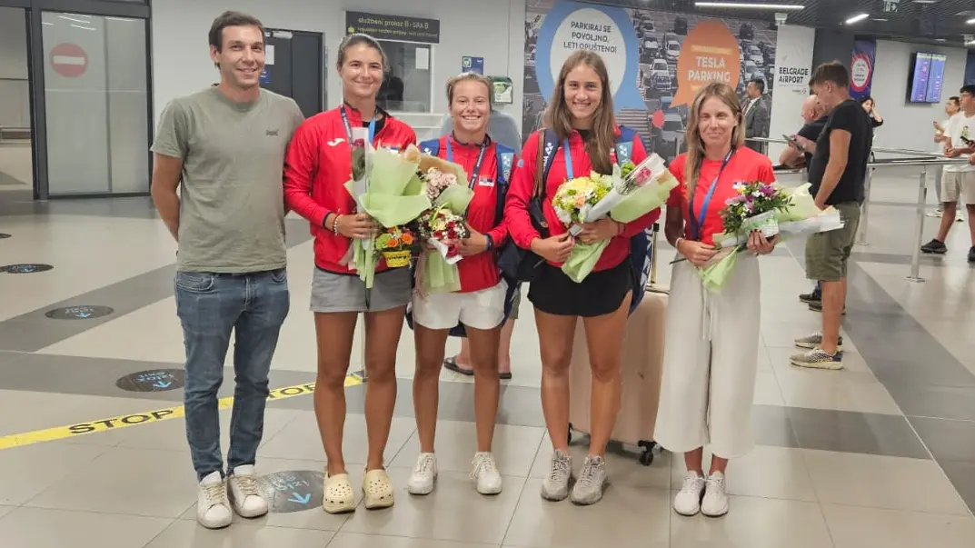 Foto: TSS - I. RadoševićŽenska teniska reprezentacije Srbije do 18 godina, koja je na EP svoje generacije u Francuskoj osvojila bronzanu medalju, tačno oko ponoći doputovala je u Beograd. Selektorka Milana Spremo je sa Petrom Konjikušić, Anastasijom Cvetković i Ivom Kovačević napravila veliki uspeh osvajanjem medalje. Svake godine Srbija ima čime da se pohvali, jer uvek neka generacija zablista na Letnjim kupovima.