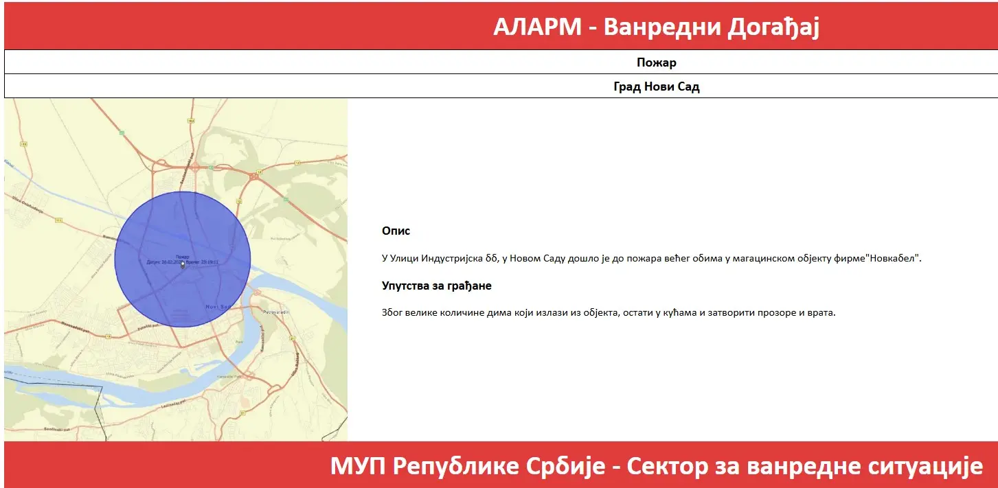 "Zbog požara u magacinskom objektu i velike količine dima ne izlaziti iz objekata dok ne prođe opasnost", navodi se u upozorenju.