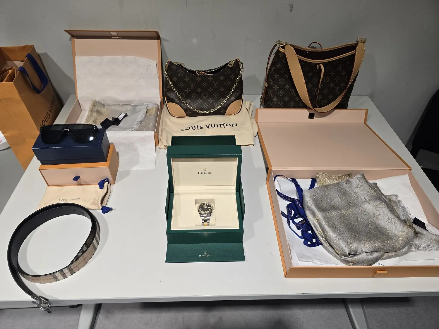 Detaljnom kontrolom su u prtljagu putnika pronađeni ručni časovnik ''rolex’’, dve ženske tašne, dve ešarpe i naočare za sunce robne marke ''Louis Vuitton'' i ženski kaiš ''burberry''.