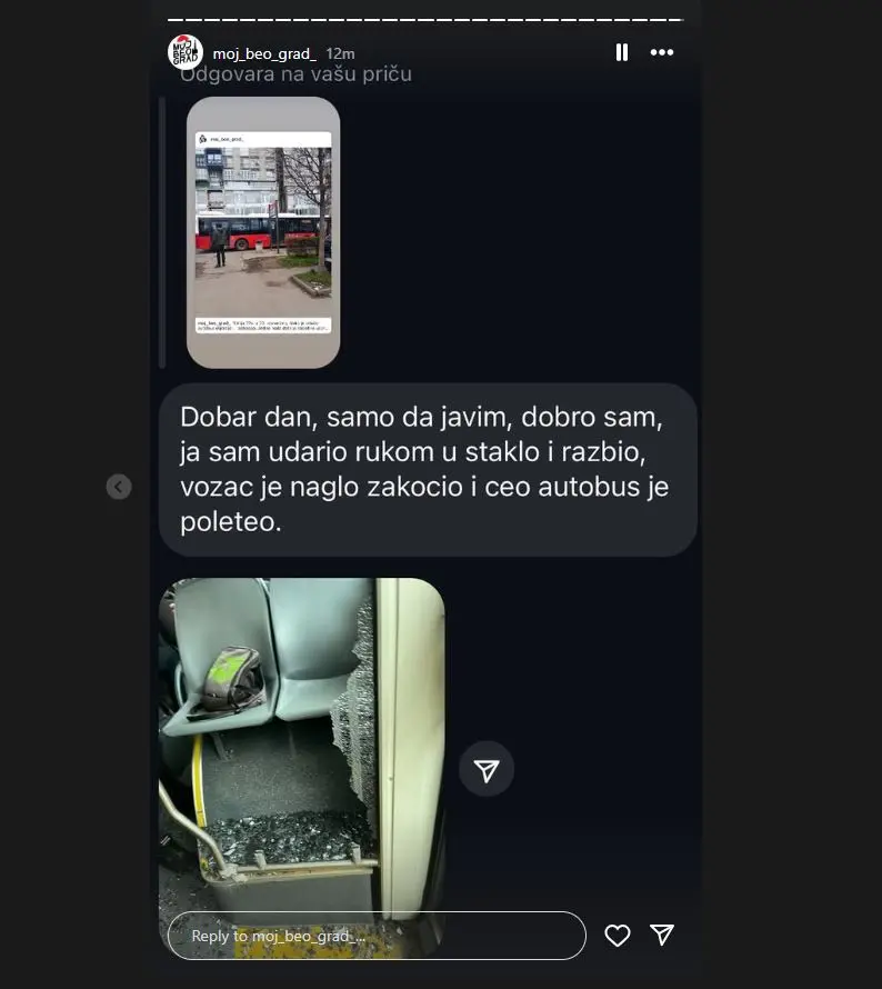 Napisao je da je dobro i da je on sam prilikom kočenja udario u staklo ispred sebe, koje je tom prilikom puklo.